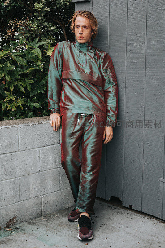 一位金发青年身着红绿渐变金属光泽运动套装,倚靠在灰色墙壁旁,背景有绿植点缀,整体风格现代且充满街头时尚感。