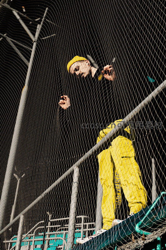 一名身穿亮黄色工装裤和同色系帽子的年轻人,正攀爬在金属防护网中,姿态动感十足,背景工业风强烈,充满街头潮流与青春张力。