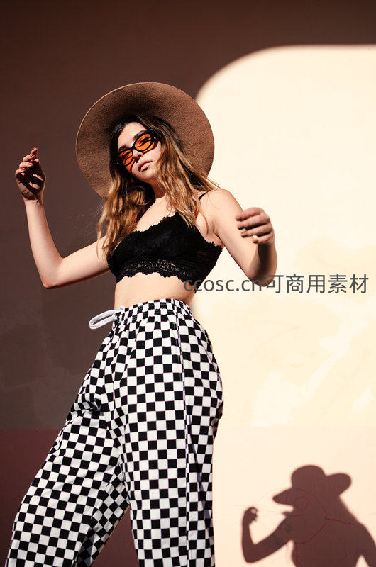 模特身着黑白棋盘格阔腿裤与黑色蕾丝吊带,头戴棕色宽檐帽,配橙色墨镜,姿态优雅如舞,墙面投射出清晰剪影,凸显艺术感与时尚气息。