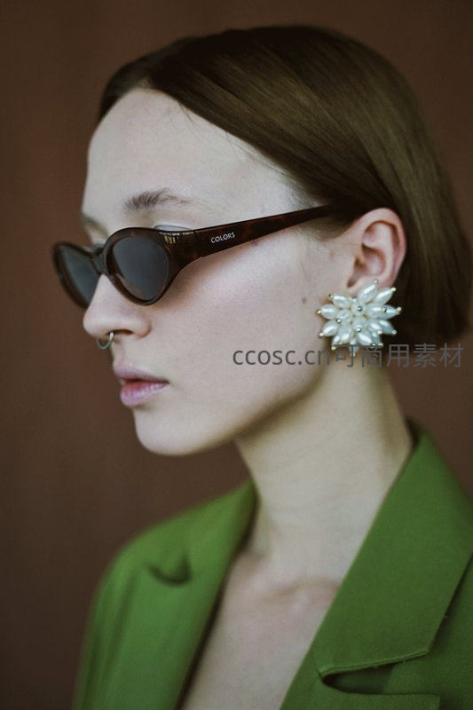 一位身穿绿色外套的女性,佩戴着棕色猫眼墨镜和花朵造型珍珠耳环,鼻翼有穿孔,神情宁静,背景为纯色墙面。