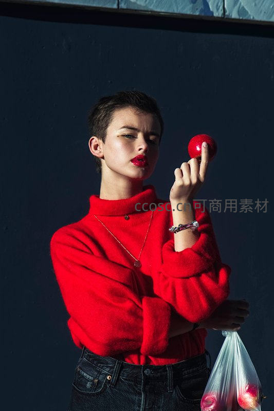一位穿着鲜艳红色高领毛衣的短发女子,涂着红唇,手持一个红苹果,眼神专注地凝视前方,背景为深色墙面,整体风格现代而富有艺术感。