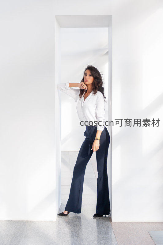 一位身着白色衬衫与深色阔腿裤的女子,倚靠在明亮的白色门框内,阳光透过形成斑驳光影,她神情沉静,姿态优雅,营造出极简而专业的氛围。
