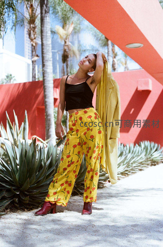 女子穿着鲜艳的黄色罂粟花图案长裤,搭配黑色上衣与酒红色短靴,在红墙与热带植物构成的几何空间里摆出放松姿态,阳光明媚,尽显加州式的慵懒与活力。