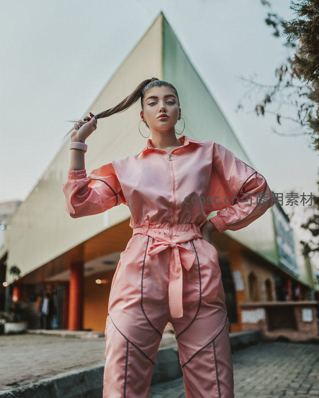 一位年轻女性身着亮粉色连体衣,在现代几何建筑前摆出自信姿态,展现了都市街头的时尚魅力与个性风采。