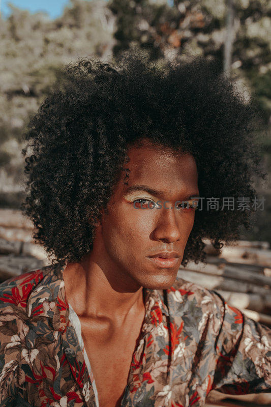阳光洒在黑人男子蓬松卷发上,他身穿热带花卉衬衫,眼神专注而深邃,背景是模糊的森林与木桩,充满自然野性美。