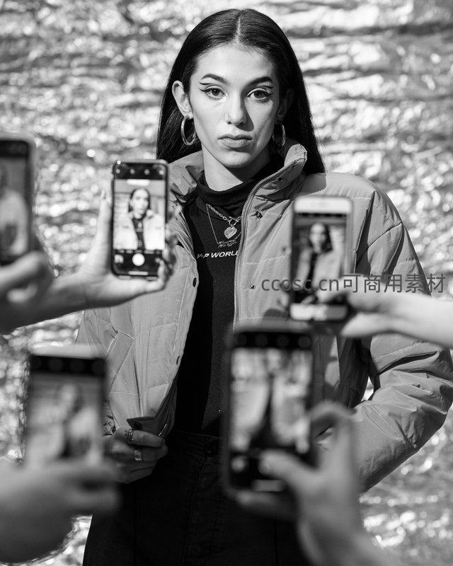 一位妆容精致的女性在户外被多名粉丝用手机环绕拍摄,画面采用黑白风格,突显其冷艳气质与现场热闹氛围,反映当代社交媒体时代的追星文化。