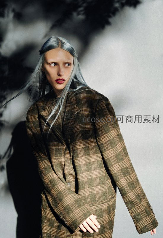 银发模特身着复古格纹西装,神情冷峻,背景光影交错,营造出强烈的视觉冲击力和高级时尚感。