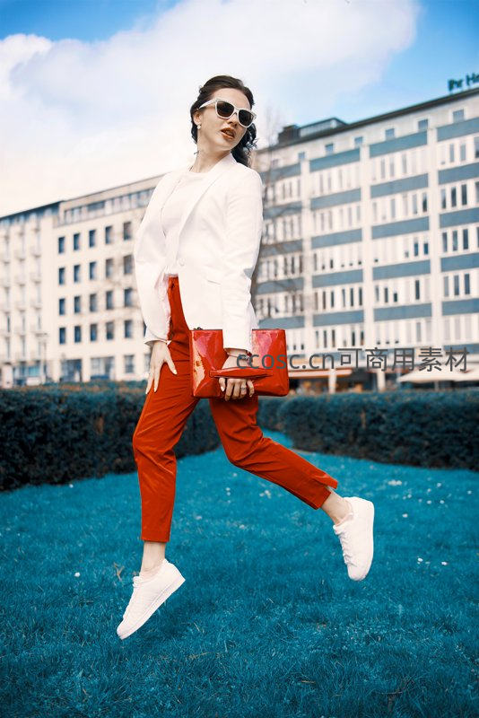 女子身着白色西装外套与鲜红长裤,在蓝绿色草坪上腾空跃起,手提红色亮面手包,背景是现代建筑群,动感十足,彰显都市女性的自信与活力。