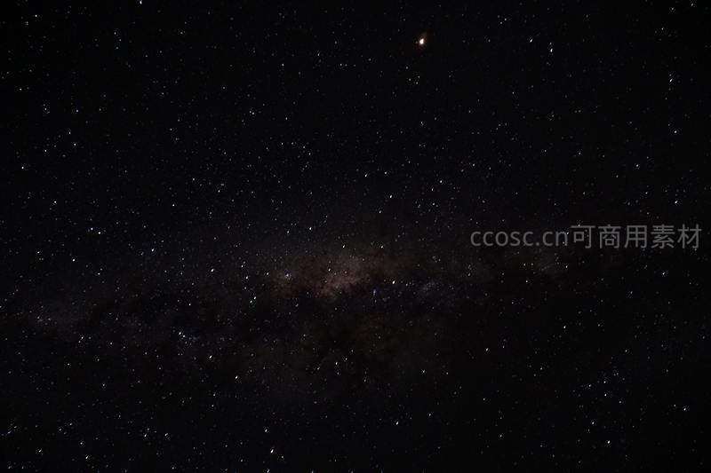 漆黑天幕下,银河如一条朦胧的光带横亘中央,稀疏星辰散落四周,一颗明亮行星悬于上方,尽显宇宙的深邃与宁静。