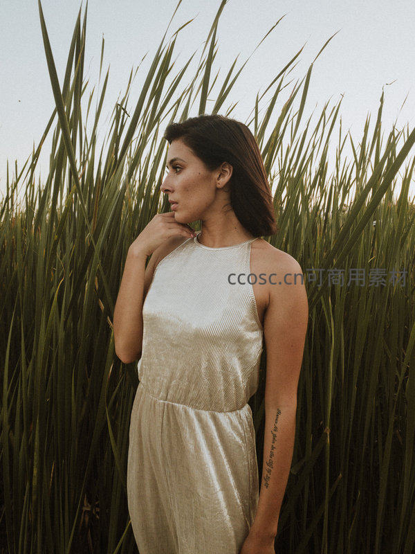 一位身穿浅色连衣裙的女子静立于高耸的芦苇丛中,手托下巴凝望远方,手臂上的纹身若隐若现,营造出宁静而略带忧郁的氛围。