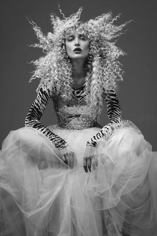 一位金发模特身着华丽亮片上衣与蓬松纱裙,爆炸式卷发在空中飞扬,展现极具张力的时尚艺术感。
