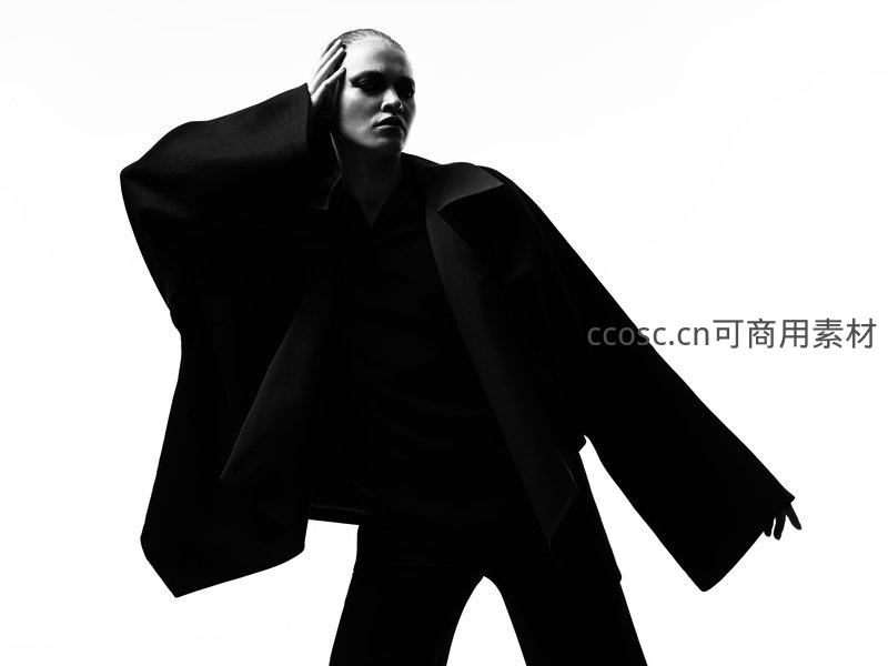 模特身披宽大黑色斗篷,姿态冷峻,纯白背景突出服装廓形,呈现强烈的视觉冲击与现代艺术风格。