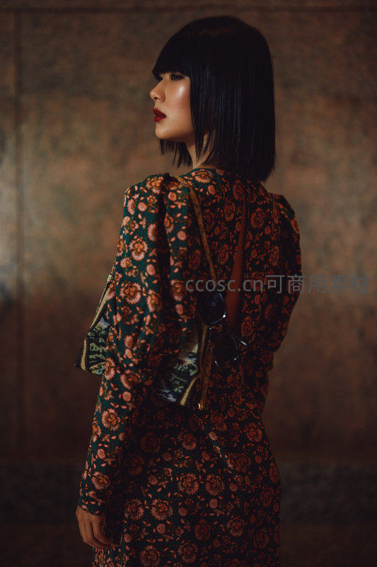 黑发女子身着深绿底橙花印花露背连衣裙,侧身回眸,红唇点缀,背景斑驳墙面衬托出浓郁复古氛围。
