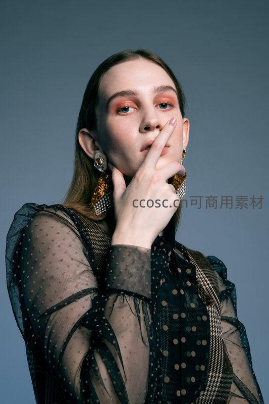 女子身穿黑底波点透视上衣,佩戴华丽耳饰,眼影色彩鲜艳,手指轻触嘴唇,姿态优雅神秘,展现现代时尚魅力。