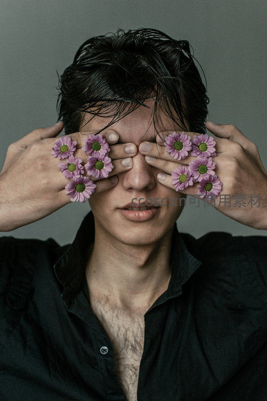男子双手各持数朵紫雏菊遮住双眼,湿发微乱,神情平静,黑色衬衫衬托花朵色彩,形成强烈视觉对比,富有艺术创意。
