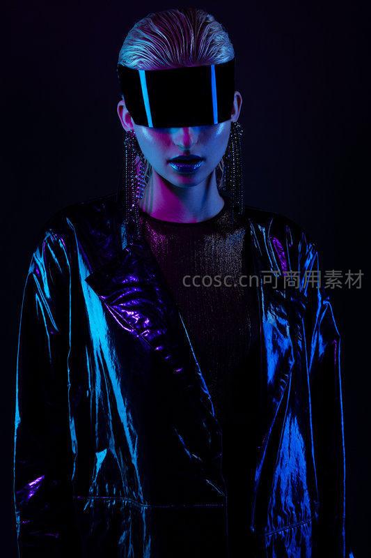 模特在深色背景下被蓝紫色霓虹灯光照亮,佩戴科技感墨镜和闪亮金属外套,营造出强烈的赛博朋克视觉效果。