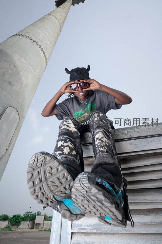 少年坐在大型金属结构上,戴着恶魔角帽子和墨镜,穿着破洞牛仔裤与厚底运动鞋,展现街头潮流与工业美学的融合。