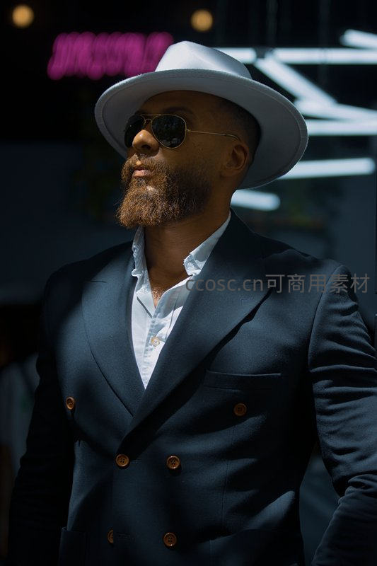一位蓄着浓密胡须的男士头戴白色礼帽、身着深色双排扣西装,佩戴墨镜,在霓虹灯映衬下展现出成熟稳重又不失潮流的都市魅力。