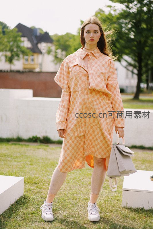 年轻女子身着橙色格纹长款衬衫裙,搭配白色运动鞋和简约手袋,站立在绿草坪上,背景为欧式建筑,整体风格休闲又时髦。