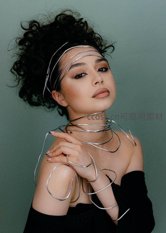 一位卷发女性身披黑色露肩装,颈部与肩部缠绕着银色金属线条,眼神深邃,营造出前卫艺术与神秘氛围的视觉效果。
