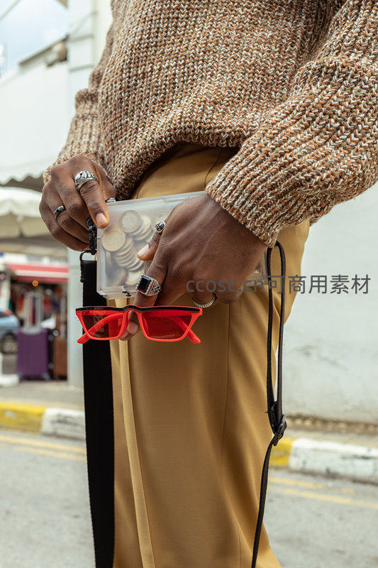 一位时尚达人穿着针织毛衣和卡其色长裤,手拿透明小包和红色太阳镜,佩戴多枚戒指,展现都市街头潮流风格。