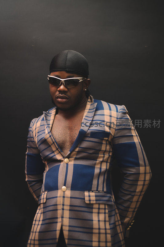 男子身穿蓝棕格纹西装,内搭敞开,头戴黑色头巾,佩戴银框墨镜,神情冷峻,尽显自信与潮流态度。