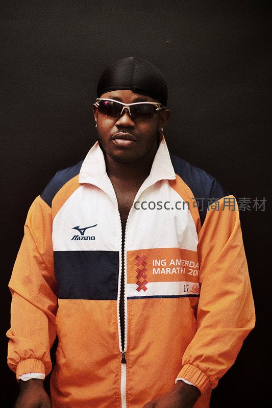 一名男子身穿橙白蓝拼色Mizuno复古运动夹克,佩戴墨镜和头巾,神情自信,背景深邃,尽显80年代运动风尚。