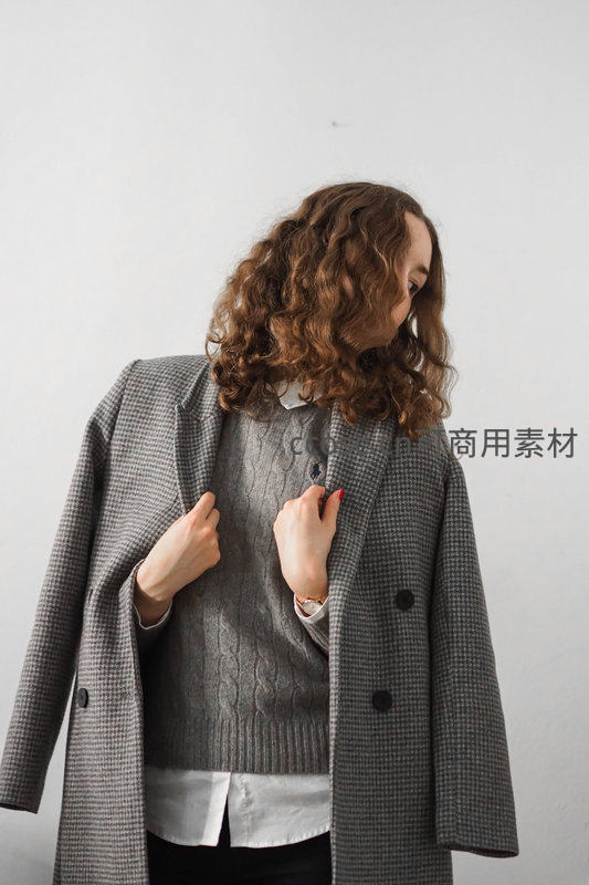 卷发女子低头整理灰色格纹大衣,内搭针织毛衣与白衬衫,姿态自然,整体造型简约大方,适合秋冬日常通勤。