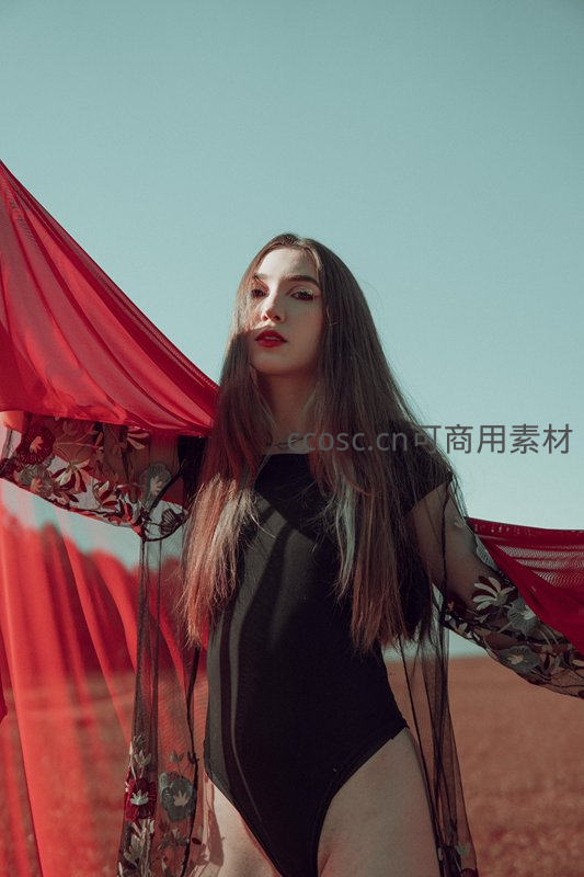 在广袤的沙漠背景下,一位长发女子身着黑色紧身衣,手持飘逸的红色薄纱,眼神迷离,展现出强烈的视觉冲击力和浪漫主义风格。