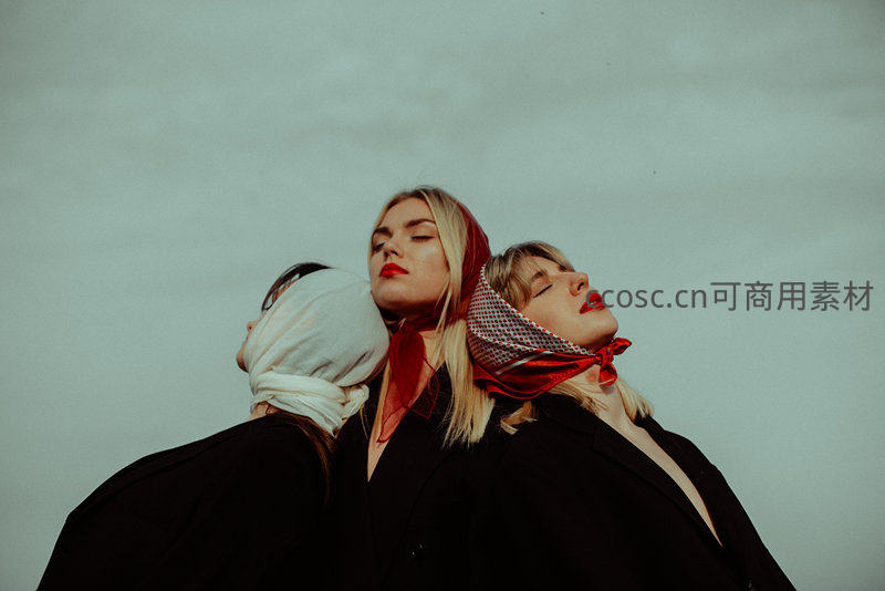 三位金发女性身着黑色外套,佩戴不同颜色头巾,在灰白背景下闭目沉思,展现优雅与艺术感。