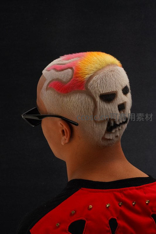 后脑勺精心雕刻的骷髅头与火焰图案,搭配酷炫墨镜和铆钉服饰,展现前卫大胆的街头艺术风格。