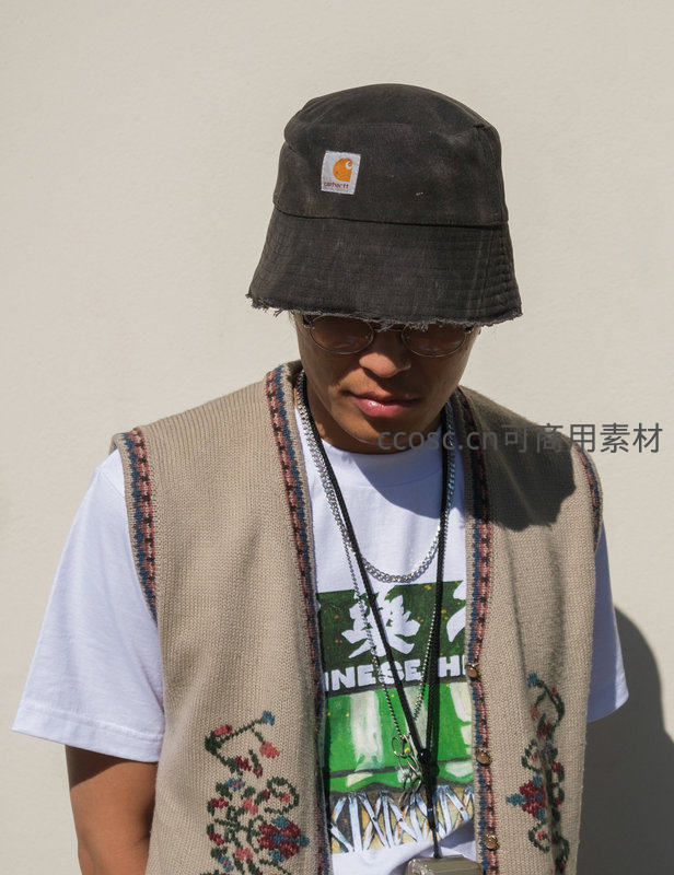 佩戴深色Carhartt渔夫帽,搭配民族风针织马甲与印花T恤,整体造型融合复古与街头元素,尽显年轻态度。