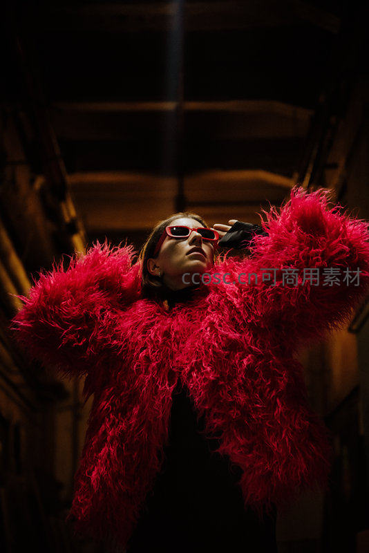 一位女性身着鲜艳的红色羽毛外套,佩戴红色墨镜,在昏暗的巷道中摆出酷炫姿态,展现强烈的个人风格与街头时尚感。