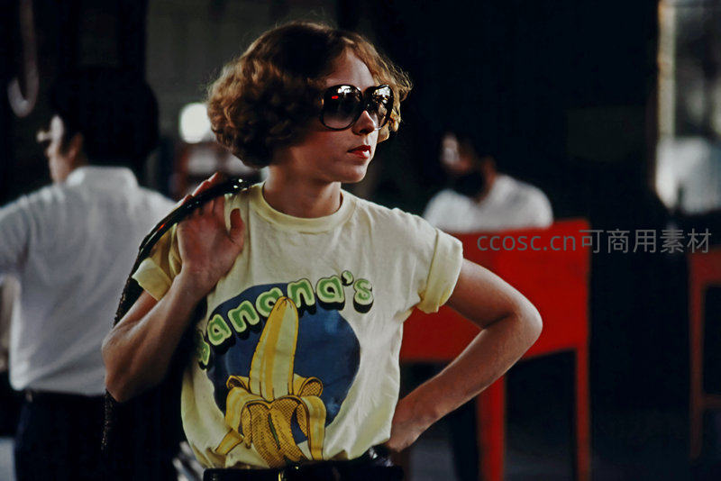 身穿印有香蕉图案的复古T恤,搭配大框墨镜和蓬松卷发,女孩在街边自信站立,散发浓郁的80年代美式街头风情与青春活力。
