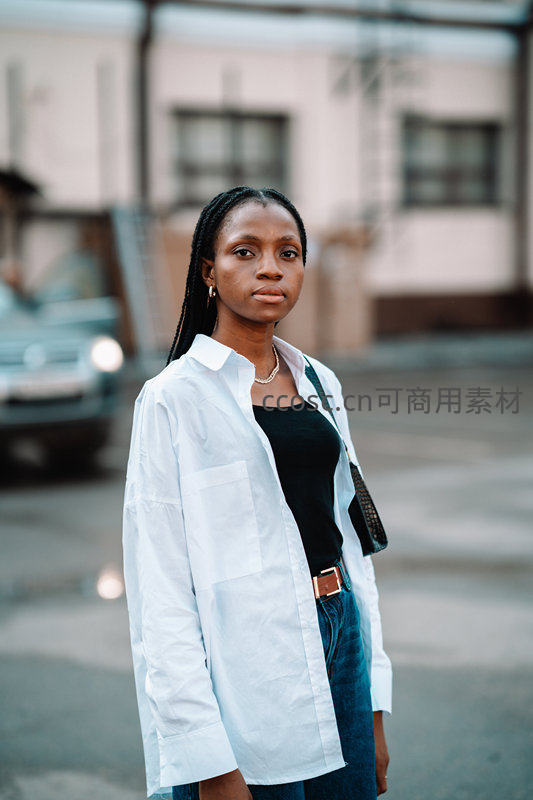 黑人女性身着宽松白衬衫搭配黑色内搭与牛仔裤,站在城市街道上,神情沉静自信,呈现简约而现代的都市女性日常穿搭风格。