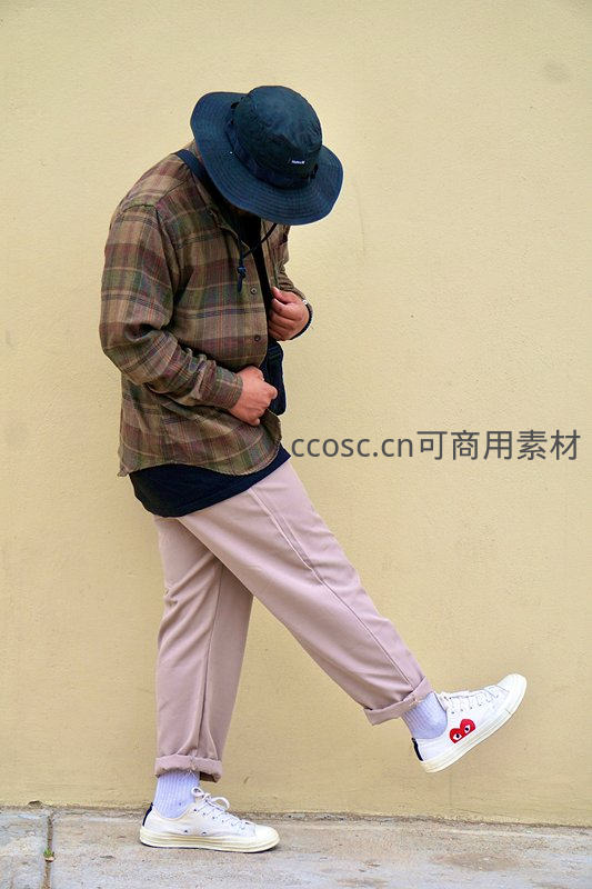 男子头戴深色渔夫帽,身穿格纹衬衫与浅色长裤,脚踩带红心标志的白色运动鞋,靠墙行走姿态轻松,展现日系街头休闲穿搭风格。