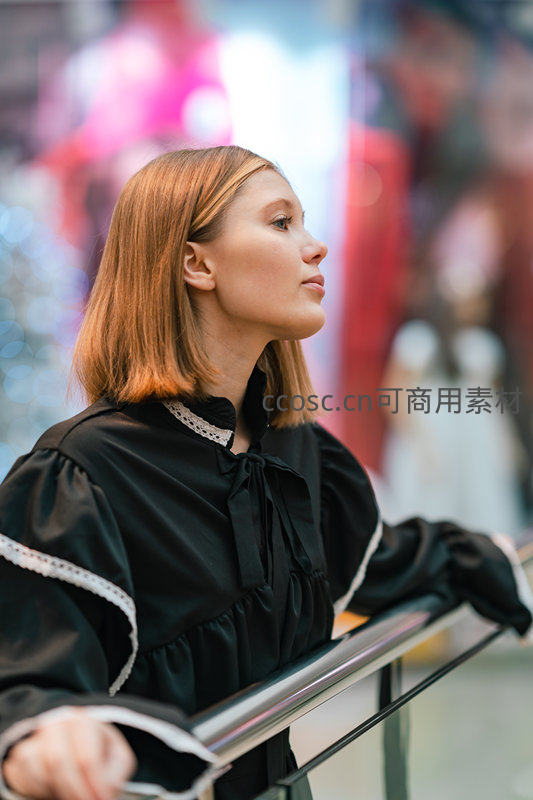 金发女子身穿带蕾丝领的黑色泡泡袖上衣,站在商场扶梯旁,侧脸凝视远方,背景虚化灯光营造出梦幻都市氛围。