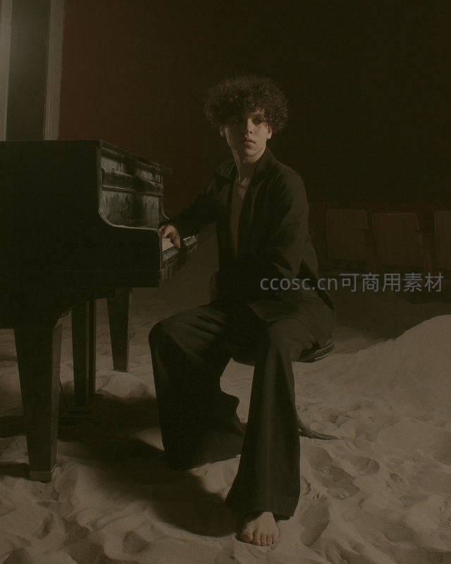 卷发少年身着黑色西装赤脚坐在铺满细沙的舞台上,身旁是黑色三角钢琴,氛围神秘而富有艺术感,仿佛在等待演奏开始。