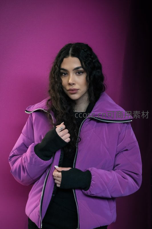 一位长卷发女子身着亮紫色羽绒外套,内搭黑色上衣,眼神坚定直视镜头,展现出自信与现代都市女性的时尚风采。