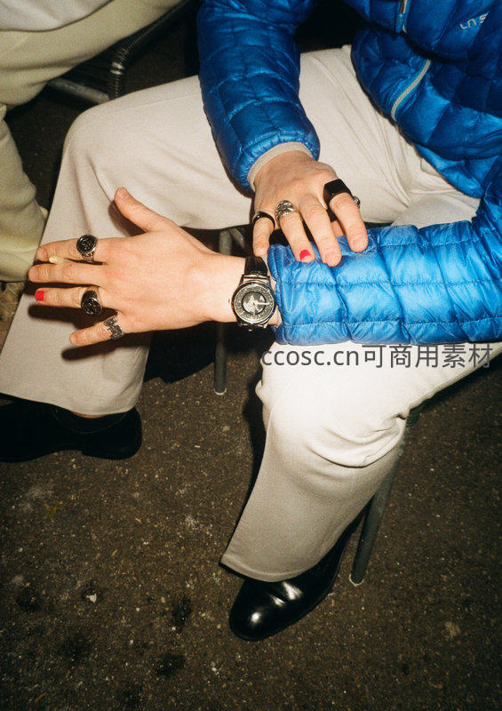 特写镜头聚焦于双手,佩戴多枚设计感戒指和经典腕表,搭配蓝色羽绒袖口与红色指甲油,彰显精致与潮流品味。