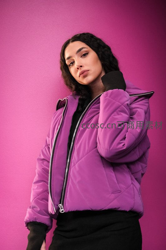 一位年轻女性身着亮紫色菱格棉服,搭配黑色内搭与下装,在纯色背景前摆出沉静姿态,展现现代都市时尚感。