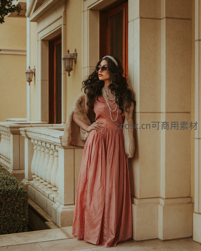 长裙名媛倚靠廊柱,卷发珍珠尽显古典气质