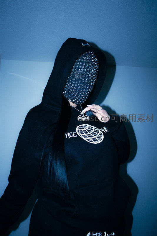 人物身穿黑色带图案连帽衫,面部被特殊材质遮挡,在蓝色冷光下营造出神秘、前卫的艺术感与强烈视觉冲击。