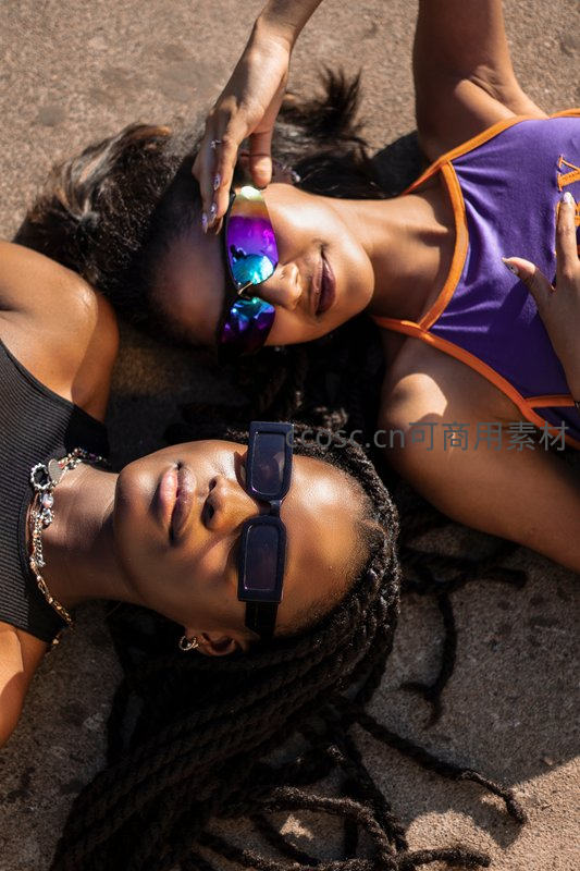 两位年轻女性惬意地躺在户外阳光下,戴着潮流墨镜,享受悠闲时光,展现出青春活力与亲密无间的友谊氛围。