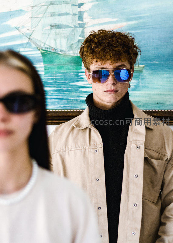 卷发少年身着米色工装外套与黑色高领衫,佩戴蓝色反光墨镜,背景是海洋帆船油画,营造出文艺又酷炫的复古氛围。