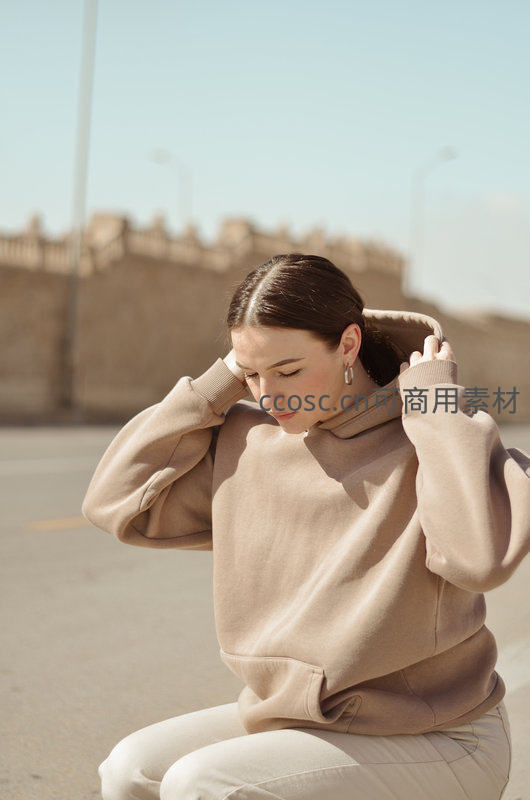米色卫衣女子户外整理帽子