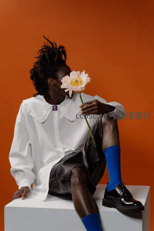 黑人青年身着白色荷叶边衬衫,坐在纯橙背景前,手持一朵粉色大丽花轻嗅,营造出宁静而富有艺术感的画面。