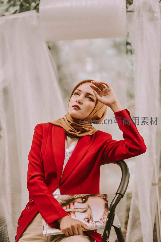 一位佩戴米色头巾的女性身着鲜红西装外套,手捧杂志,姿态优雅地坐在椅子上,眼神望向远方,充满知性魅力。