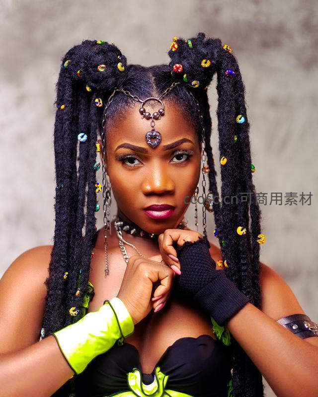 非洲女性以双马尾编发缀满彩色珠饰,佩戴心形额饰,身着黑绿撞色服装,眼神锐利直视镜头,充满舞台表演张力。