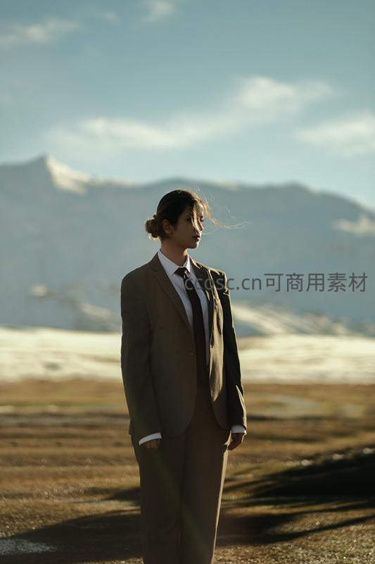 一位穿着深色西装套装的女性伫立在开阔高原上,远处是白雪覆盖的山脉,阳光洒在她身上,营造出一种孤独而强大的视觉张力。